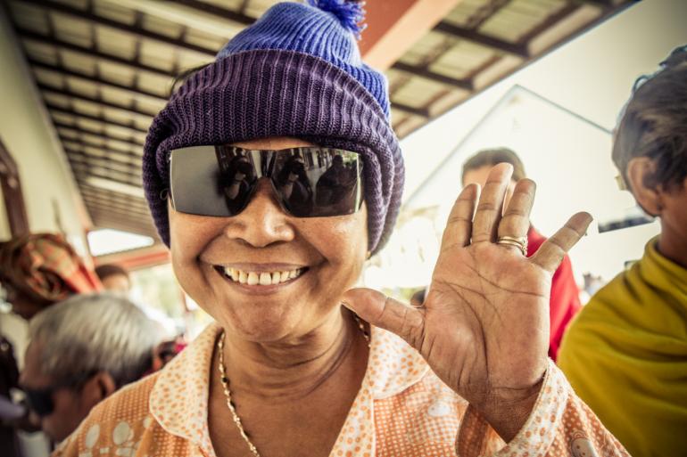 Cambodian woman wearing protective glasses after cataract surgery. ©Ellen Crystal Photography