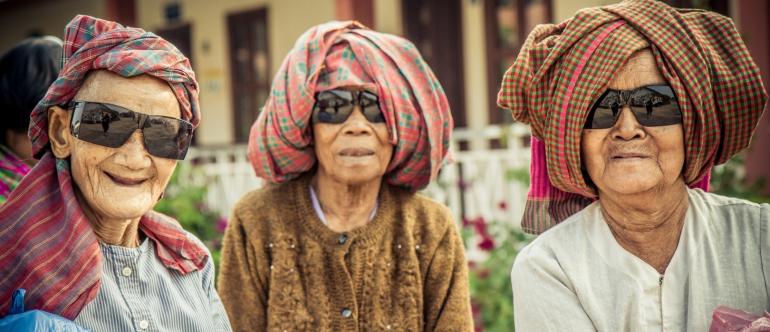 Cambodian women wearing protective sunglasses after cataract surgery. ©Ellen Crystal Photography