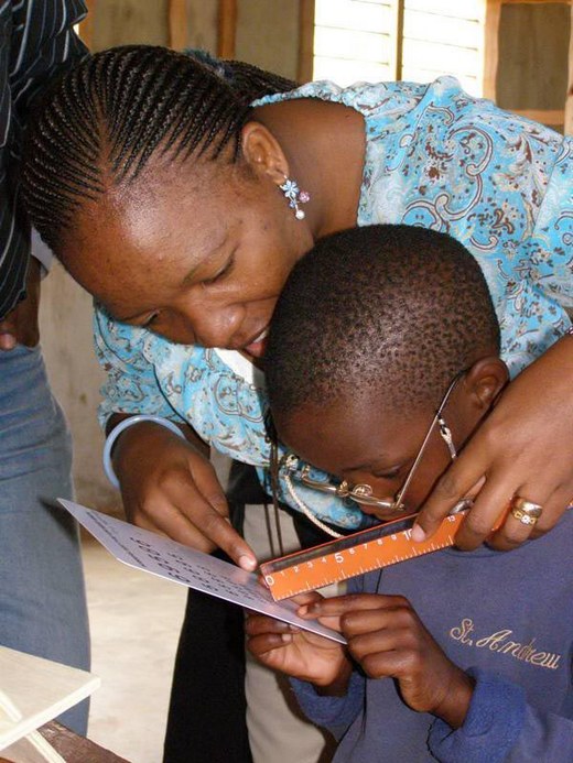 Low Vision Coordinator, Elizabeth Kishiki, working with a child with low vision at a school for the blind