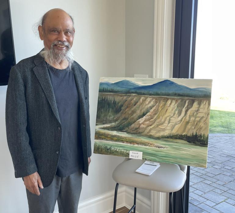 Artist Ranjan Sen with Gloria and Hugh Sutcliffe beside the beautiful watercolour painting generously donated for a door prize.