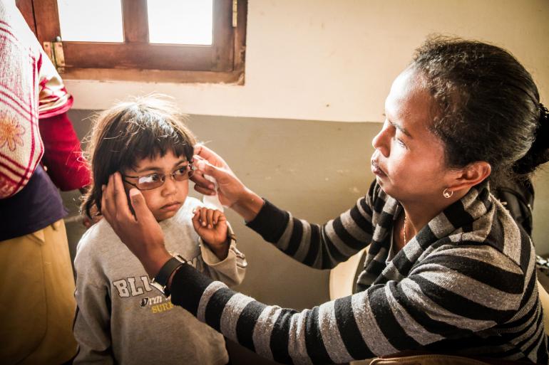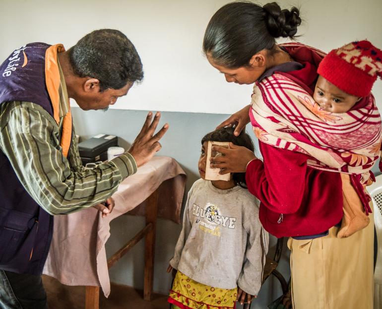 At the screening camp, Dr. Richard Andriamampihantona examined Miranto and determined the white dot in her eye was a bad allergic reaction, made worse by humidity during the rainy season.