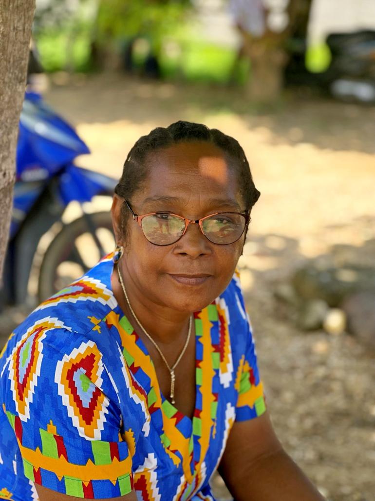 Marie Amée waiting under a tree for shade at the SALFA Community Eye Centre in Ambilobe, Madagascar