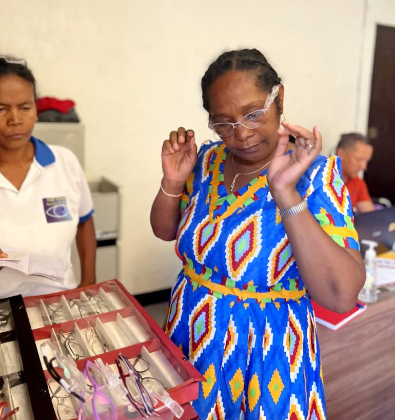 Marie Amée trying on reading glasses at the Community Eye Centre
